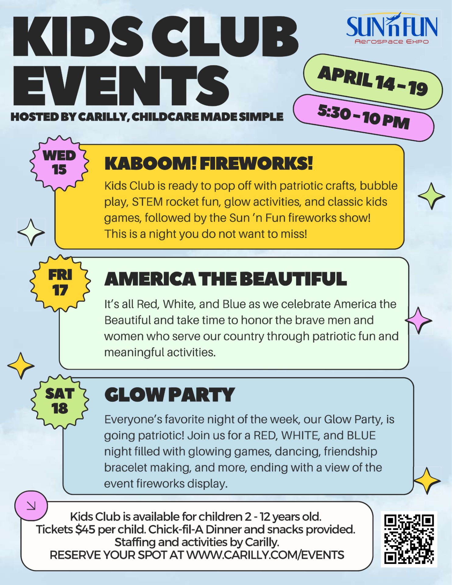 Enjoy the SUN ‘n FUN nightlife while your kid(s) are engaged in a fun-filled night of their own! Drop off your child(ren) for a night full of exciting activities, crafts, and dinner with certified sitters from Carilly. Each night’s theme will match the activities happening at the show, so you and your child(ren) can share your experiences.