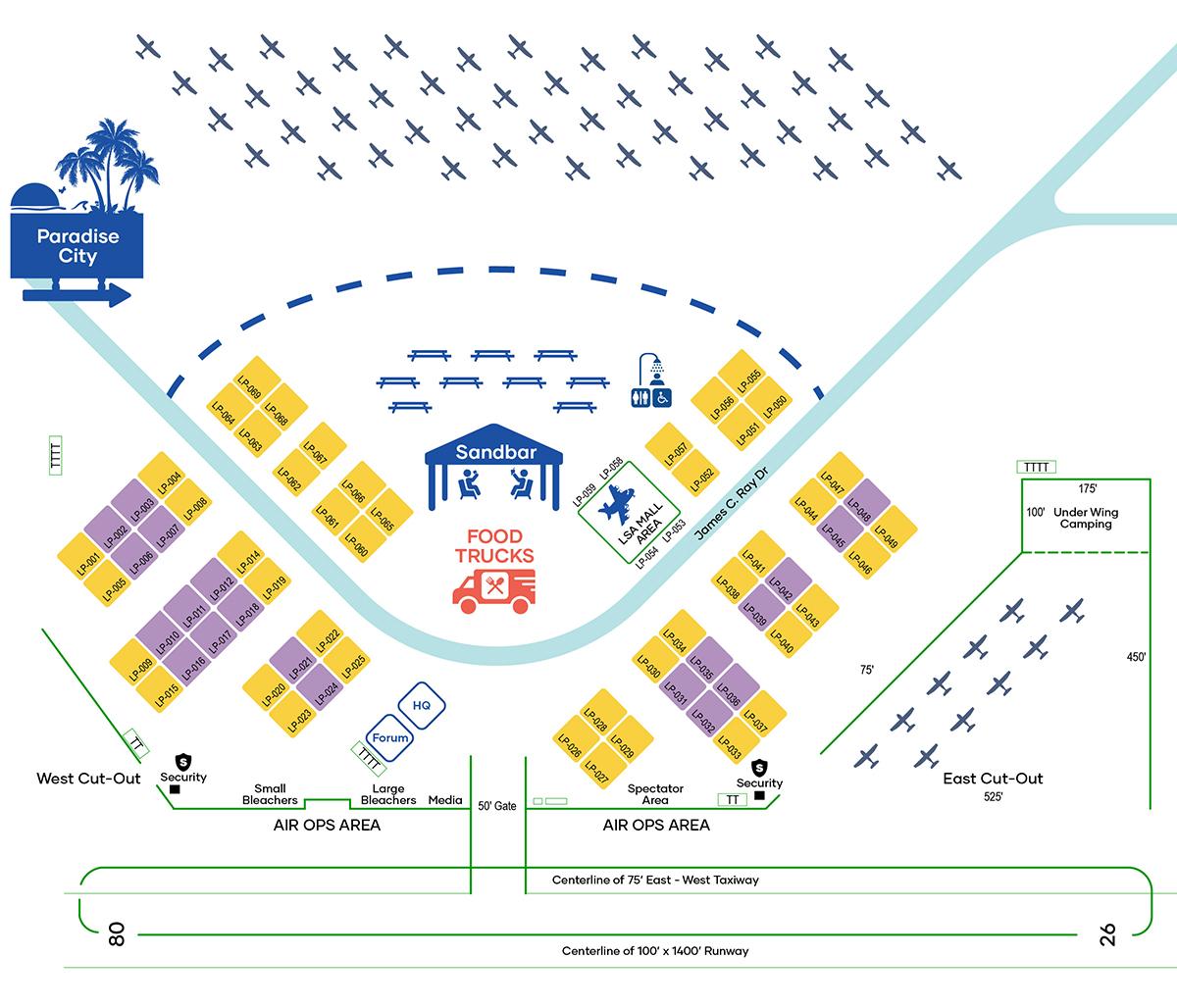The Sandbar will be co-located with our Light Plane area in Paradise City and will house food trucks, a large shade tent, picnic tables and benches. The best part? We will pipe in sound from the announcers stand so you can hear the audio from the daily airshows, night shows, and Sunset Aerial Circus.